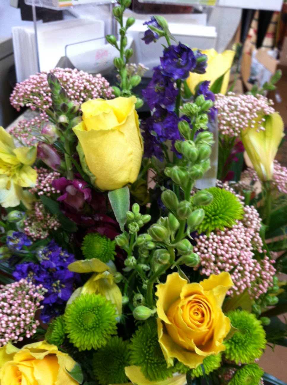 The above picture is what Kroger suggested, but I am really not feeling the hydrangea. I also don't know if I want bright bright yellow. I don't know. I love the green button mums in the picture to the right (a Kroger bouquet), but I am not a fan of roses. See, it's ridiculous. Who knows what I'll end up with.