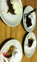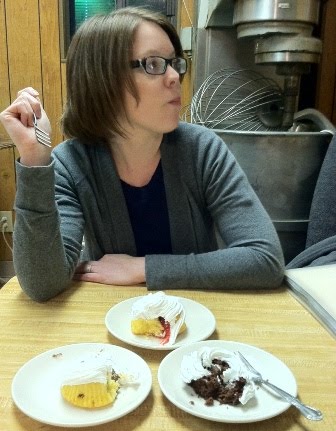 Brad and I had our first cake tasting last night and it did not go like that at all. We were given yummy cake to try. Chocolate-raspberry, yellow with strawberry filling, and marble. She brought out the carrot a few minutes after the initial three because I had specifically asked about that flavor when booking the tasting. (Photo credit: Brad or Me with the iPhone. Also, Blogger hates me and will not orient this picture correctly.)