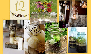 Anyway, this inspiration collage (sounds fancy, I think) is in regards to centerpieces. I'm really liking the idea of a slice of tree trunk as a base and topping it with mason jars. Within the mason jars will be some candles (thanks, Mom!) as well as some flowers. Now, I can't seem to get the idea of succulents out of my head and may collaborate with my sister to make some adorable terrariums!