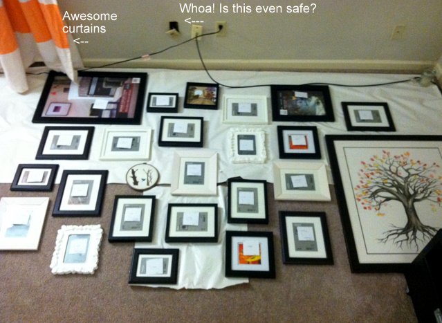 Let me back up a bit. You see, our guest book was a huge tree that our loved ones added thumbprint leaves to. It's beautiful. It is roughly 2' by 3'. It cost me $300 to frame. In addition to the tree-that-cost-almost-as-much-as-my-dress, we had a shadowbox from his parents containing dried flowers, part of a tree plate, and our invitation. We also had our ring "pillow," which is a mostly-complete cross-stitch I did. I wanted a wall of memories to celebrate our wedding and what better than a gallery wall? We would have pictures of different sizes, differing frames, and different textures courtesy of the cross-stitch and a button "S" I plan on making. Brad and I sorted through all of our wedding and engagement photos until we had a respectable amount and we dubbed the project the "wall of narcissism."
